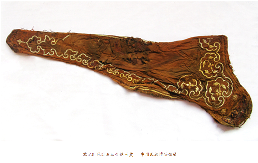我們?cè)?jīng)描述過元代納石失生產(chǎn)的空前絕后。蒙古民族把對(duì)于黃金的寶愛,傾泄進(jìn)元朝一百年的歷史時(shí)空。在整個(gè)13世紀(jì)的每一個(gè)歷史篇章,都鐫刻著納石失的金縷光影。我們?cè)谑妨侠锟吹?,天子之衣是納石失,天子之裳是納石失,天子之履依然是納石失。那么,蒙元一代,還有什么是用黃金絲線耗盡心血織繡而成的呢?現(xiàn)在,我們看到了這只金繡弓囊。