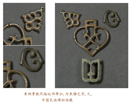 眼前此件在內(nèi)蒙古達(dá)茂旗出土的元代鎏金青銅十字架,四面排列有浮雕金剛杵紋,其正面每個(gè)金剛杵圖案上均有鎏金裝飾,十字架上部穿孔則可用于懸掛。金剛杵是藏傳佛教里的修行法器,象征力量與智慧;而十字架則是基督教文化的標(biāo)志,如此混搭,歷史便要傳遞出種種:在信仰藏傳佛教的蒙古高原,金剛杵,象征無畏圓滿,十字架,則代表救贖重生,東西方文化的結(jié)合亦呈現(xiàn)某種文明可能達(dá)到的無可比擬之高度。