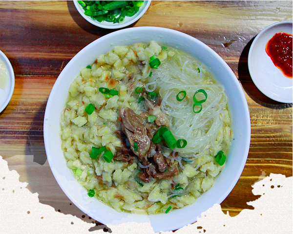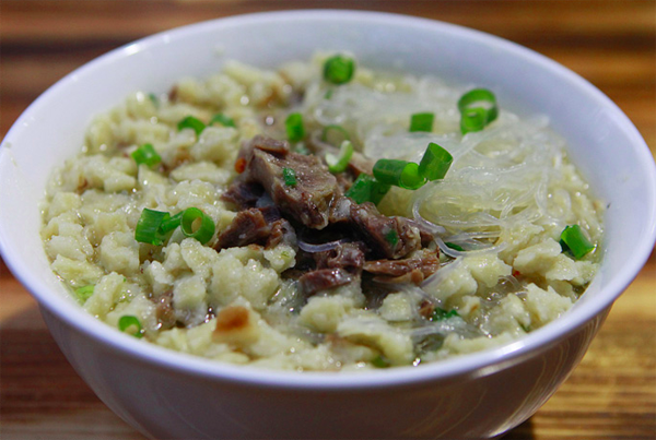 饃掰好后,請伙計(jì)呈給掌勺大廚,加羊肉湯大火快煮,加牛羊肉、粉絲、蔥花、蒜苗、香菜,優(yōu)質(zhì)的還有木耳、黃花菜和香干等即可端上來吃了。這樣一大碗自己親手掰好的泡饃,翠綠的蔥花、蒜苗、香菜、紅褐色的牛羊肉、黃色的金針菜、映襯著潔白晶瑩的粉絲、黝黑的木耳、香味四溢,。還應(yīng)注意的是:端上來的泡饃應(yīng)是泡饃墊底,粉絲覆成網(wǎng)形,佐以蔥花、香菜、牛羊肉擺成魚形在最上面,吃時(shí)左手拿勺,右手執(zhí)筷。泡饃上桌后,把辣子醬鋪在上面,切忌攪動(dòng),講究從一邊“蠶食”,以保持鮮味。糖蒜用否,個(gè)人自愿。餐后飲用一小碗原汁烹制而成的高湯,以為清口。