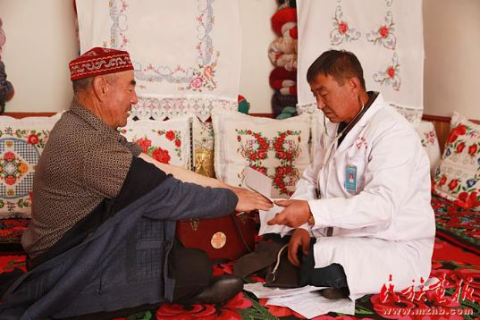 居馬泰·俄白克多年的恩師阿吾爾達·合德爾現(xiàn)在也是他的病人,這位80多歲的老人向記者說道居馬泰·俄白克翻雪山、過冰河,無數(shù)次遇險,但他仍在堅持。把我們這些患者當(dāng)作家人對待。學(xué)生時代的居馬泰·俄白克就是思想積極,熱心善良的好孩子。工作后獲得榮譽受到習(xí)總書記的接見,回到工作崗位上,很多牧民騎馬趕來看望他,他就利用這個機會向牧民宣傳黨的惠民政策、民族團結(jié)和健康保健等知識?!?/p>