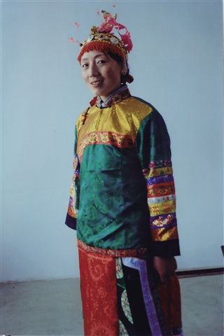 女子結(jié)婚或在節(jié)日期間的穿戴更為別致,身穿以綢緞縫制的兩袖口寬的繡花褂子,袖口鑲有七道或九道花邊,花邊上繡有各種花卉圖案,做工精細(xì),鮮亮多彩。頭戴鳳冠,土族語叫“首帕冠”,鑲著瑪瑙和珊瑚,前沿密墜細(xì)小的珍珠穗子,中間是細(xì)銀絲制成的鳳凰。戴鳳冠時(shí)還需要綴假發(fā)誓,并用長(zhǎng)簪加固。佩戴這種頭飾,土族語叫“素不都腦達(dá)”(即索卡斗?扭達(dá)爾之音轉(zhuǎn))。