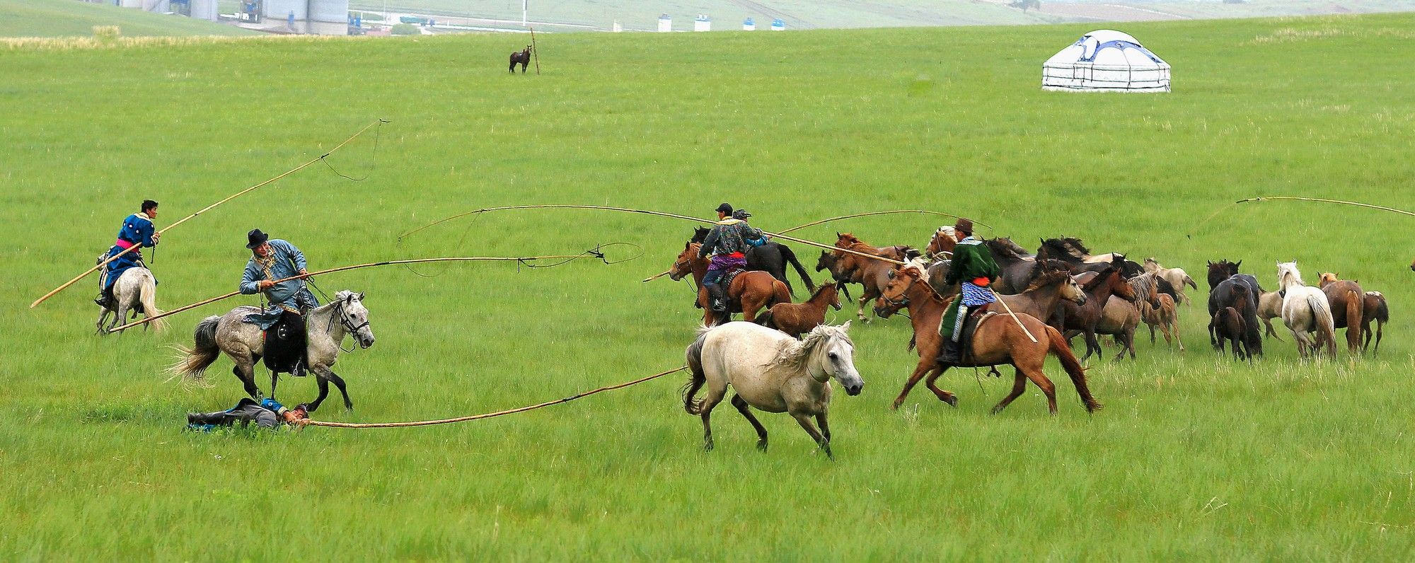 繩索套馬是蒙古族的傳統(tǒng)體育活動。原為牧民放牧時約束馬匹的一種手段。比賽時,選一烈性難馴的馬,先令其疾馳。參賽的成群騎手,手持打有活結的繩索,騎馬緊追,到一定距離,拋出繩索套馬,以先套準并能束住烈馬者為勝。